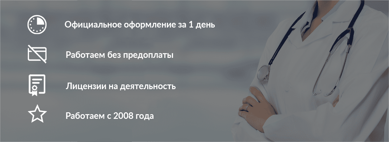 Мы предлагаем возможность недорого оформить любой необходимый медицинский документ, получить отпуск на лечение на работе или отсрочку в учебном заведении. Обратившись к нам один раз, вы гарантированно не захотите возвращаться в шумные поликлиники с их километровыми очередями и многочасовым ожиданием на неудобных скамейках.